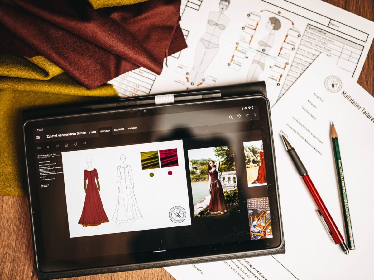 Nun wählen wir anhand der Entwurfszeichnung gemeinsam die finalen Stoffe aus, bevor wir den Schnitt für dein Gewand anfertigen. Falls nötig, bekommst du zusätzlich ein 3D-Modell deiner neuen Gewandung, um dir das Design noch besser vorstellen zu können. Hier können wir letzte Details wie Längen, Ärmelformen oder den Nahtverlauf anpassen.